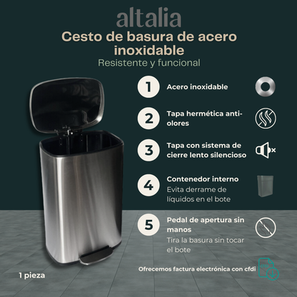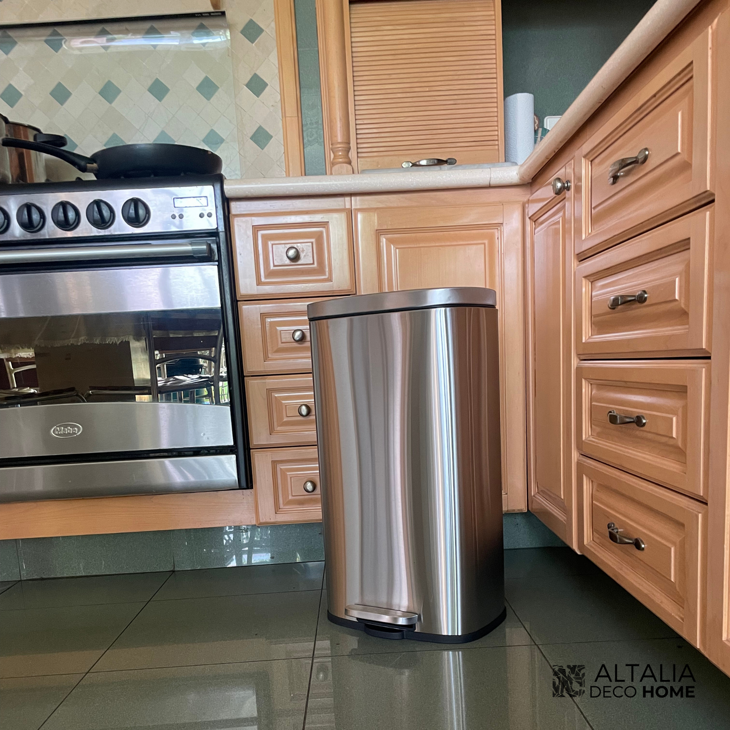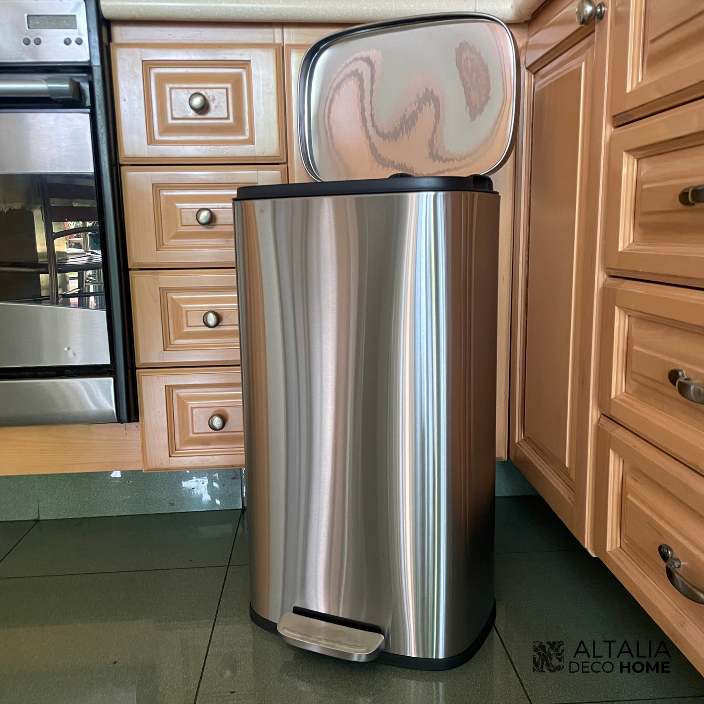 Introduce durabilidad y estilo con nuestro bote de basura con pedal grande para cocina de acero inoxidable. Su diseño robusto agrega un toque moderno y funcional a tu espacio.
