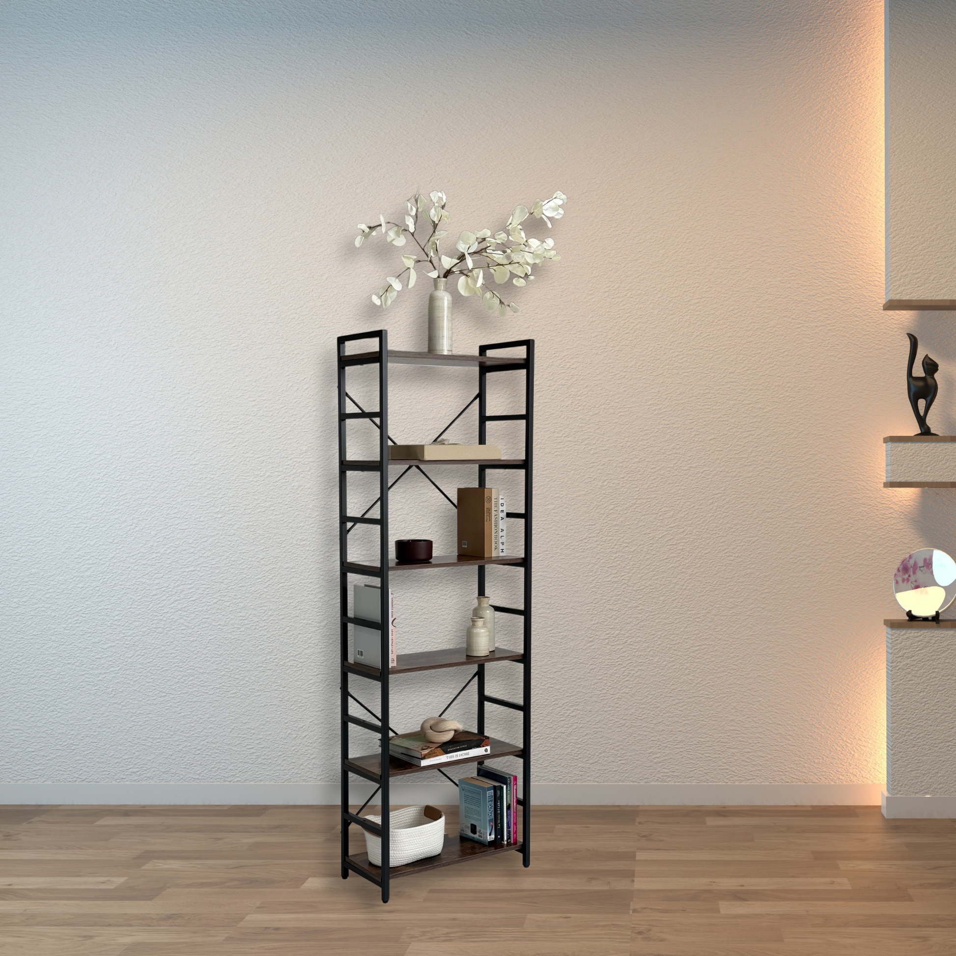 Estilo moderno y versátilCombina un diseño minimalista con materiales de alta calidad, perfecto para cualquier espacio; su estructura de acero resistente asegura una durabilidad excepcional, mientras que las repisas de madera añaden un toque cálido y sofisticado, ideal para resaltar tu colección de libros favorita o tus objetos decorativos más queridos.