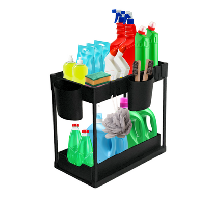 Transforma tu gabinete de cocina con nuestro estante plástico multifuncional. Ideal para organizar productos de limpieza y accesorios, se adapta a diversas áreas como debajo del fregadero, la alacena y el baño.