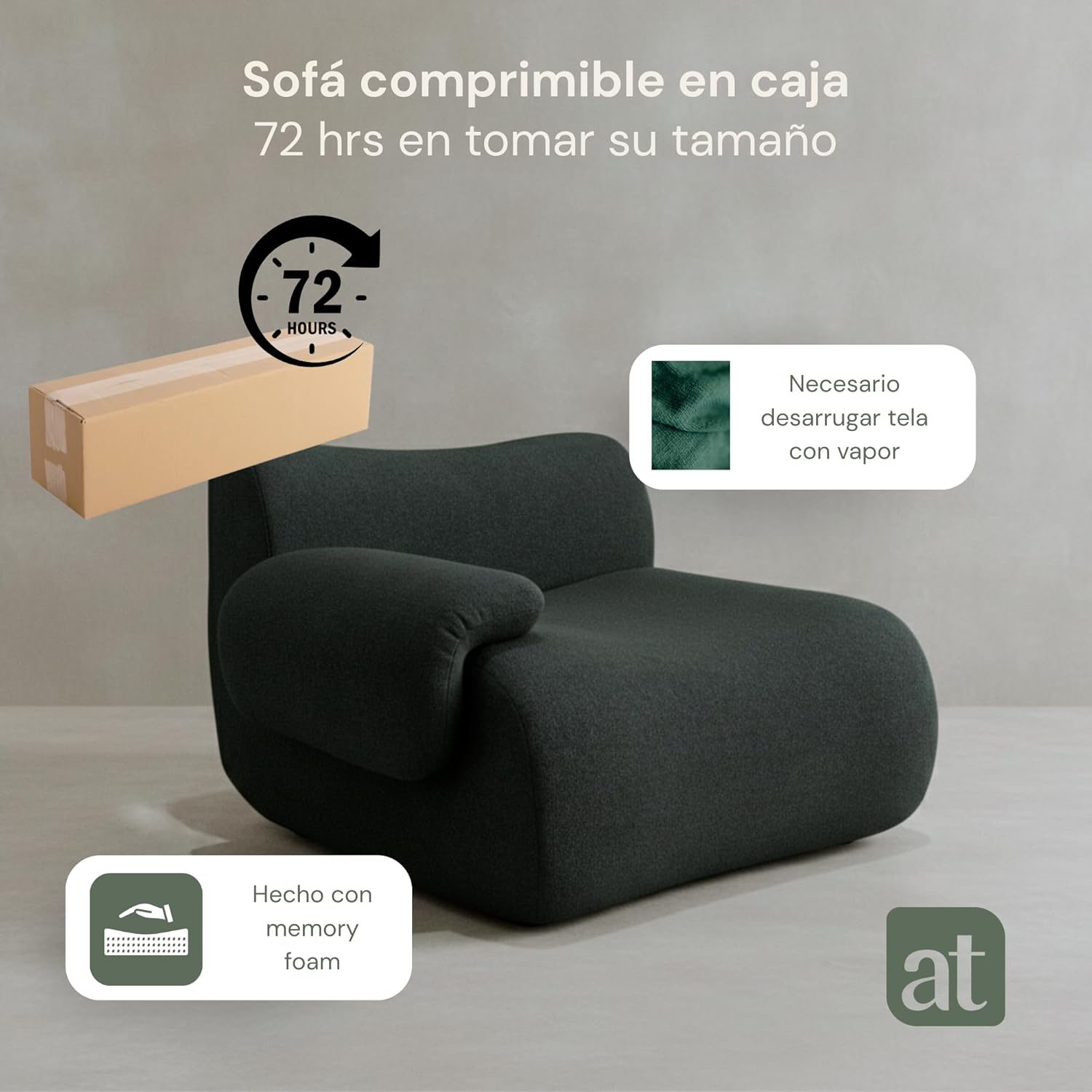La tela Verde Olivo de sensación suave de este sofá en caja comprimido con memory foam no solo es elegante, en conjunto con su composición de espuma expandible tipo colchón suave